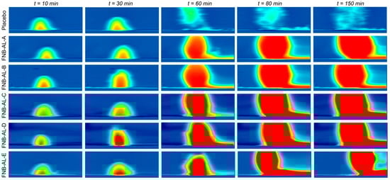 In nonstop flow conditions, in situ real-time release of the drug from NCSMs was meant to mimic the intestinal environment. The dissolution behavior analyses were conducted using UV-imaging experiments with FNB-NC-containing NCSMs. These NCSMs were mounted on a 3D-printed sample holder and inserted in the UV imager, and the plane to the 3D surface of NCSMs containing the drug was available for picture capture. The ActiPix SDI 300 UV software for the real-time dissolution imaging system calculated the intrinsic dissolution rates (IDRs), surface concentrations, and surface mass release from a 3D downstream gap of a quartz sample cell of the NCSM surface by UV absorbance, which was monitored for 150 min. In NCSMs, the dissolution rate increased after 30–50 min of running the experiments. Selected snapshots illustrate NCSMs containing drug nanocrystal dissolution where the function of time is shown qualitatively (Figure 8). The area in blue shows the background (blank) absorbance, while red, yellow, and light blue show the intensity of the drug concentrations (e.g., deep red color corresponds to elevated concentration (absorbance values)). A short video clip of FNB-NC dissolution from NCSMs can be found in the Supplementary Materials. The photographic inspection of the sample snapshots indicated an improvement of color shade (light blue to dark red) with time. The real-time UV-imaging system was proficient at visualizing the in situ release of drug particles in media observations, which was most likely due to the swelling hydrogel matrix cage of NCSMs.