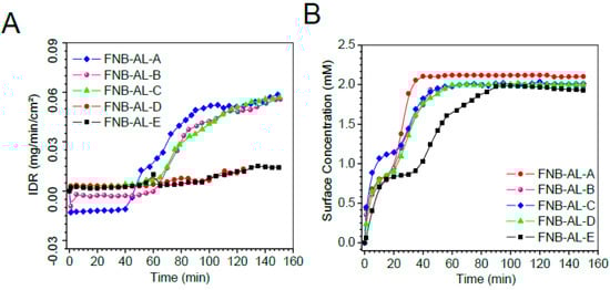 As displayed in the IDRs in Figure 9A, the dissolution of NCSMs was completed at varying times. Sample mass releases (Supplementary Figure S2C) showed no significant changes with drug contents in NCSMs. Figure 9A shows the surface concentrations of the drug when it swelled in release media followed by FNB-NC release with time, which remained constant after ~40 min. However, Figure 9A displays the IDRs for NCSMs, which showed a direct correlation with the USP-II release pattern. Typically, the highest absorbance contour was collected 40–50 min into the dissolution run for each NCSM samples. In parallel, AL placebo spherical microparticles showed early swelling followed by disappearance due to complete deconstruction of the AL 3D matrix. NC-formulated NCSM samples showed a relative delay with an elevated swelling bump with more red color indicative of UV absorption of the FNB.
