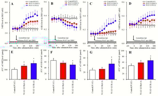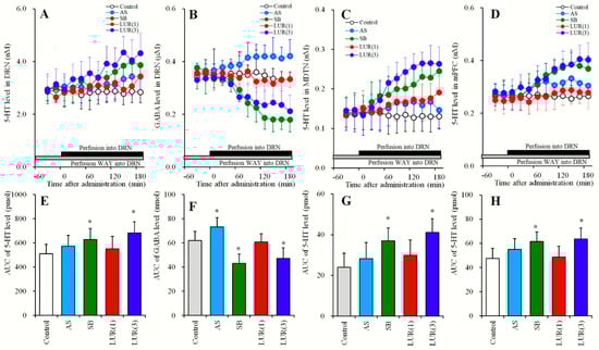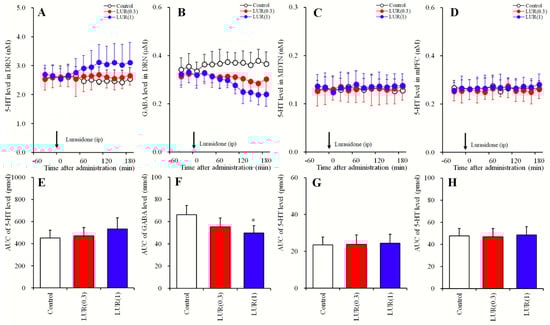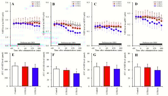 Dose-dependent effects of systemic administration of lurasidone on extracellular levels of 5-HT in the DRN, MDTN, mPFC and γ-aminobutyric acid (GABA) in the DRN (Study_1). (A,C,D) indicate dose-dependent effects of intraperitoneal administration of lurasidone (LUR: 0, 0.3 and 1 mg/kg) on extracellular levels of 5-HT in the DRN, MDTN and mPFC, respectively. (B) indicates dose-dependent effects of intraperitoneal administration of lurasidone (LUR: 0, 0.3 and 1 mg/kg) on extracellular GABA level in the DRN. Y-axis: Mean ± SD (n = 6) of extracellular levels of 5-HT (nM) and GABA (μM); X-axis: Time after administration of lurasidone (min). Arrows indicate intraperitoneal administration of lurasidone. Microdialysis was conducted to measure the releases of 5-HT and GABA. (E–H) indicate the area under curve (AUC) value of extracellular levels of 5-HT (pmol) and GABA (nmol) after intraperitoneal administration of lurasidone from 20 to 180 min of (A–D), respectively. Opened, red and blue columns represent the AUC values of 0, 0.3 and 1 mg/kg lurasidone administration, respectively. * P < 0.05; relative to control (lurasidone free) by MANOVA with Tukey’s post hoc test.