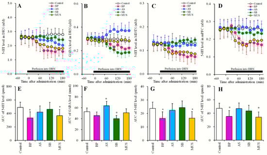 Effects of local administration of BP554, AS19, SB269970 and muscimol into the DRN on extracellular levels of 5-HT in the DRN, MDTN, mPFC, and GABA in the DRN (Study_3-2). (A,C,D) indicate effects of perfusion with 1-[3-(3,4-Methylenedioxyphenoxy) propyl]-4-phenyl- piperazine (BP: 50 μM), (2S)-(+)-5-(1,3,5- Trimethylpyrazol-4-yl)-2- (dimethylamino)tetralin (AS: 1 μM), (2R)-1-[(3-Hydroxyphenyl)sulfonyl]- 2-[2-(4-methyl-1- piperidinyl)ethyl]pyrrolidine (SB: 10 μM) and muscimol (MUS: 1 μM) on extracellular levels of 5-HT in the DRN, MDTN and mPFC, respectively. (B) indicates effects of perfusion with BP554, AS19, SB269970 and muscimol into the DRN on extracellular GABA levels in the DRN. Y-axis: Mean ± SD (n = 6) of extracellular levels of 5-HT (nM) and GABA (μM); X-axis: Time after administration of target agents (min). Closed bars indicate perfusion with target agents into the DRN. Microdialysis was conducted to measure the releases of 5-HT and GABA. (E–H) indicate the AUC value of extracellular levels of 5-HT (pmol) and GABA (nmol) during perfusion with target agents from 20 to 180 min of (A–D), respectively. Opened, pink, light blue, green and orange columns represent the AUC values of perfusion with control, BP554, AS19, SB269970 and muscimol, respectively. * P < 0.05; relative to control by MANOVA with Tukey’s post hoc test.