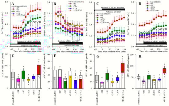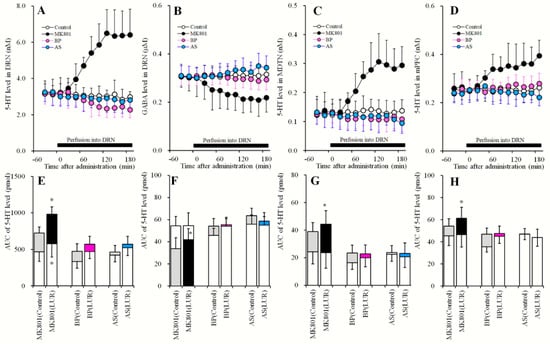 Effects of local administration of MK801, BP554 and AS19 into the DRN on 5-HT releases in the DRN, MDTN, mPFC, and GABA in the DRN, after sub-chronic administration of lurasidone (Study_6). (A,C,D) indicate effects of perfusion with MK801 (5 μM), BP554 (BP: 50 μM) and AS19 (AS: 1 μM) into the DRN on extracellular levels of 5-HT in the DRN, MDTN and mPFC, respectively, after the sub-chronic administration of effective dose of lurasidone (3 mg/kg/day for 7 days). (B) indicates effects of perfusion with MK801, BP554 and AS19 into the DRN on extracellular GABA level in the DRN, after sub-chronic administration of effective dose of lurasidone. Y-axis: Mean ± SD (n = 6) of extracellular levels of 5-HT (nM) and GABA (μM); X-axis: Time after administration of target agents (min). Closed bars indicate perfusion with target agents into the DRN. Microdialysis was conducted to measure the releases of 5-HT and GABA. (E–H) indicate the AUC value of extracellular levels of 5-HT (pmol) and GABA (nmol) during perfusion with MK801, BP554 or AS19 from 20 to 180 min. Opened columns indicate the AUC values of pre-perfusion of target agents in Figure 4 and Figure 7. Gray columns indicate the AUC values of during perfusion with target agents (MK801, BP554 and AS19) in Figure 4. Closed, pink and light blue columns indicate AUC values of during perfusion with target agents (MK801, BP554 and AS19) in (A–D), respectively. * P < 0.05; relative to control (without sub-chronic lurasidone administration) by MANOVA with Tukey’s post hoc test.