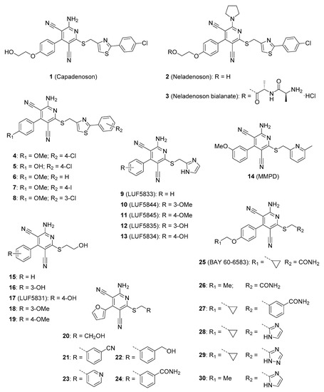 Subsequently, on the basis of data previously published in the patent from Bayer, Beukers and coworkers evaluated some 3,5-dicarbonitrile derivatives as human A2B adenosine receptor agonists, which were synthesized with the previously reported procedure [31]. Both the synthetic approaches used the thiol intermediate that was reacted with the suitable organic halide to obtain the final 2-thioalkylpyridine derivatives.