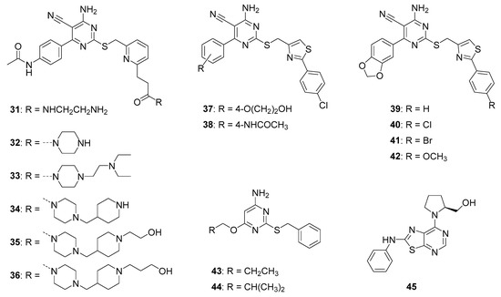 These molecules were 4-amino-6-aryl-5-cyano-2-thiopyrimidines, presenting an acetylamino group in the para-position of the 6-phenyl ring and various substituents within the 2-chain (as examples are reported compounds 31–36; Figure 2; Table 2). These compounds present several similarities compared to the above-described cyanopyridine agonists, with the main difference consisting in the absence of one cyano group of the pyridines substituted by a nitrogen atom in the aromatic scaffold. Several of these compounds were claimed as being endowed with low nanomolar potency at the A2AAR.