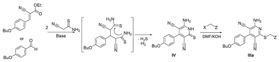 The reaction pathway for the production of such a series of compounds was previously reported by other authors [82,83,84]. In particular Dyachenko and Litvinov obtained the 6-amino-3,5-dicyanopyridine-2(1H)-thione derivatives IIIa from ethyl 3-(4-butoxyphenyl)-2-cyanoacrylate or 4-butoxy benzaldehyde and cyanothioacetamide in basic conditions by N-methylmorpholine with the reaction mechanism suggested, as depicted in Figure 3 [85].