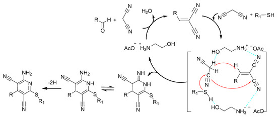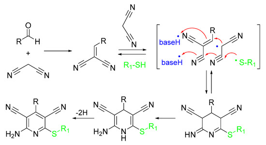 The hypothesized mechanism of the reaction includes the formation of 1,4-dihydropyridines, which undergo oxidation by the Knoevenagel adducts rather than air oxygen (Figure 4). As base, 1,4-diazabicyclo[2.2.2]octane (DABCO) or trimethylamine was used and 2-amino-3,5-dicarbonitrile-6-thio-pyridine derivatives in 20–48% yields were obtained due to the formation of 1,4-dihydropyridines as side products.