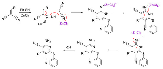 - Sridhar, M.; Ramanaiah, B.C.; Narsaiah, C.; Mahesh, B.; Kumaraswamy, M.; Mallu, K.K.R.; Ankathi, V.M.; Shanthan Rao, P. Novel ZnCl2-catalyzed one-pot multicomponent synthesis of 2-amino-3,5-dicarbonitrile-6-thio-pyridines. Tetrahedron Lett. 2009, 50, 3897–3900. [Google Scholar] [CrossRef]