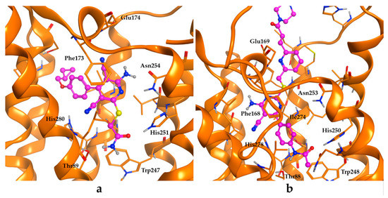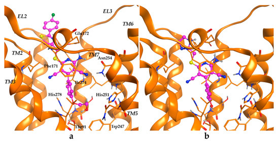 This docking conformation makes the heterocyclic core still be located in the center of the binding cavity, but the phenyl ring directly linked to it points toward the extracellular environment, while the thioarylalkyl chain is inserted in the depth of the cavity. The exocyclic amine again has a polar interaction with a glutamate residue in EL2 (i.e., Glu174 in A2BAR), while the polar interaction with the conserved asparagine 6.55 (Asn254 in the A2BAR) is given by the exocyclic amine and the nitrogen atom of the pyridine core, while the cyan group next to the exocyclic amine points toward the extracellular space. However, this arrangement appears possible only for derivatives presenting a small thioarylalkyl group. A further docking conformation was observed at the A2AAR for the Otsuka Pharmaceutical pyrimidine-based agonists (Figure 8b) [109]. This conformation is an upside-down version of the general binding mode described above, with the thioarylalkyl group externally located and the phenyl ring in the depth of the cavity. The exocyclic amine interacts with TM2 residues, while the cyano group points toward the conserved histidine in the 7.43 position (i.e., His278 in the A2AAR). The polar interaction with the conserved asparagine in the 6.55 position (i.e., Asn253 in the A2AAR) is given by one of the nitrogen atoms of the heterocyclic core. This arrangement could be in agreement with the affinity data, but its occurrence apparently depends on the arrangement of the EL2 glutamate residue (i.e., Glu169 in A2AAR) [109].