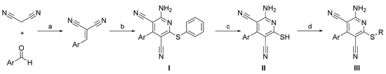 The first series of compounds were substituted 3,5-dicarbonitrile pyridine. Their synthesis and biological evaluation were reported in two patents by Bayer [26,27]. The synthetic procedure involved the reaction of an aldehyde with malononitrile in basic conditions to give the aryilidenemalononitrile, which reacted with another molecule of malononitrile and, in the presence of thiophenol, furnished the 2-amino-4-aryl-6-(phenylthio)pyridine-3,5-dicarbonitriles (general structure I). The latter compound was used for the production of the useful intermediate 6-thiol derivative II by elimination of the phenyl group with sodium sulfide and then treatment with chloridric acid to get the thiol derivative. The reaction of II with the suitable alkylhalide chains furnished the desired final 3,5-dicarbonitrile pyridines III (Scheme 1).