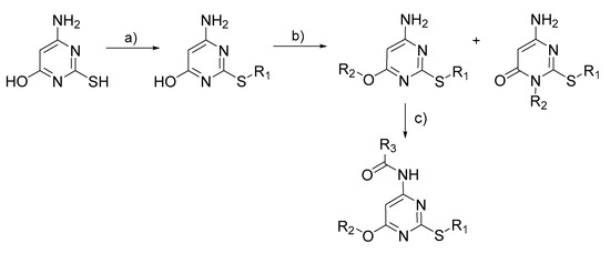 Starting from 2008, Cosimelli and coworkers published a series of compounds with agonist properties for ARs characterized by a common 6-alkoxypyrimidine scaffold [79,80,98]. The synthesis of such compounds was obtained by alkylation of the sulfur atom in the 2-position of the commercially available 4-amino-6-hydroxy-2-mercaptopyrimidine with the suitable alkyl halide in an aqueous solution of sodium hydroxide (Scheme 5). With the aim at alkylating the oxygen atom at 6-position, the 2-S-alkyl pyrimidines where then reacted with the suitable alkyl halide in DMF and excess of potassium carbonate. The reaction furnished a mixture of O- or N-alkylated derivatives due to the keto-enolic equilibrium forms present of the reagent. Finally, the O-alkylated derivatives were reacted with the opportune anhydride and concentrated sulfuric acids as catalyst.