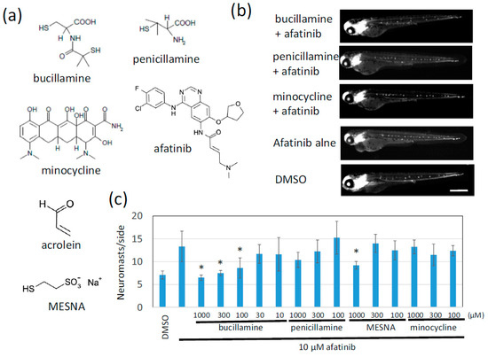 The classical FDA-approved antirheumatic drugs penicillamine and bucillamine contain one or two reactive sulfhydryl groups (Figure 2a). We tested these two drugs in the zebrafish phenotypic evaluation system to determine whether they cancel the afatinib-induced extra-neuromast phenotype. Afatinib reproducibly induced the formation of extra neuromasts, twice as many as the control larvae. Bucillamine significantly decreased the number of neuromasts back to the level of control larvae in a dose-dependent manner (Figure 2b,c). Penicillamine and MESNA also tended to inhibit afatinib activity. Interestingly, minocycline, which is clinically used to relieve skin rash caused by EGFR-targeting therapies [19], had no effect or was much less effective compared to bucillamine (Figure 2b,c).