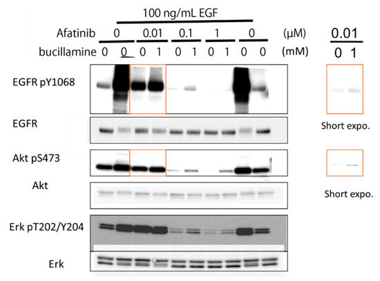 Bucillamine inhibited afatinib-mediated inhibition of EGFR autophosphorylation and downstream signaling. A431 cells expressing endogenous WT EGFR were pre-incubated with 0.01–1 μM afatinib in the presence or absence of 1 mM bucillamine. Then, 100 ng/mL of EGF was added to the culture medium. After 15 min incubation, cell lysates were prepared and analyzed by Western blotting with specific antibodies, as indicated. Shorter-exposure images are shown on the right. EGFR, epidermal growth factor receptor; WT, wild type.