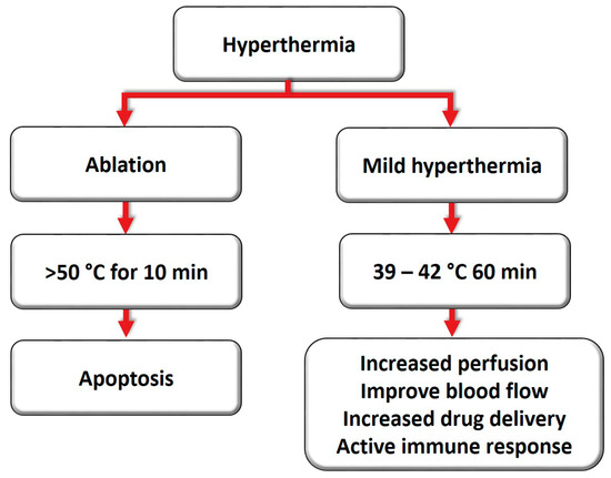 Ablation and mild hyperthermia are two standard methods to achieve hyperthermia clinically (Figure 1). Ablation refers to a short burst of high temperatures (> 50 °C, for 10 min), whereas mild hyperthermia is achieved by applying lower temperatures for long periods (39–42 °C, for approximately 60 min) [11,14]. The physiological response to these strategies is distinct. During ablation, hyperthermia may provoke denaturation and coagulation of cellular proteins, rapidly destroying the cells inside the target tissue [15]. Although thermal ablation can effectively destroy tumor tissue, a major limitation is the difficulty of heating large tumors, since the entire tumor cannot reach an adequate temperature for coagulation and necrosis [16].