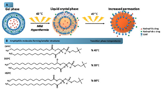 Mechanism of drug release from thermosensitive liposomes. (A) Schematic illustration of the mechanism of phase transition of the lipids that form the liposome bilayer. The increase of the temperature above the transition phase temperature (47 °C) leads to higher bilayer permeability, and consequently, the drug release is favored. (B) Amphiphilic molecules forming lamellar structures and their transition phase temperatures. Tc: Phase transition temperature.