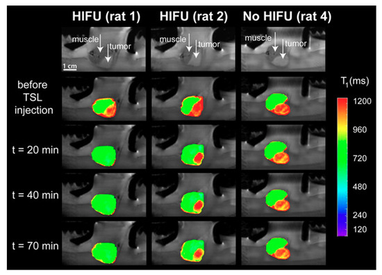 A thermosensitive liposome formulation co-encapsulating DOX and a contrast agent was developed by Negussie et al. [106]. The stability of the technique, visualization ability, and content monitoring by magnetic resonance imaging associated with high-intensity focused ultrasound (MRI–HIFU) suggested that this technique combined with thermosensitive liposome could enable real-time monitoring and spatial control of drug release [106]. Temperature-sensitive liposomes (TSLs) co-encapsulating DOX and 250 mM Gadolinium [Gd (HPDO3A) (H2O)], a clinically approved T1-weighted MRI contrast agent, were also evaluated for delivering HIFU-mediated drugs under MRI [107]. A good correlation between the uptake of DOX and the concentration of gadolinium in the tumor was found, implying that the in vivo release of DOX from TSLs can be probed in situ with the time of longitudinal relaxation of the co-encapsulated MRI contrast agent. Anatomical MRI images of the tumor and surrounding mouse muscle were acquired before the administration of TSLs and directly after the first and second local hyperthermia treatment (Figure 3). It was possible to observe the difference of the tumors with MRI, before the administration of the TSLs and after the administration of TSLs in combination with mild hyperthermia, which induced significant changes in the tumor [107].