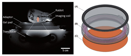 Experimental set-up for mild hyperthermia in rabbit V × 2 tumors using a clinical MRI–HIFU system. Axial survey image of a rabbit on top of a water-filled animal adaptor. A waterproofed receive-only imaging coil is fitted around the lower leg. The bottom film of the animal adaptor is coupled to the window of the clinical HIFU system by a gel pad; the HIFU transducer is in the oil bath below. Overlays indicate the relative size of the ultrasound beam path (dashed) and treatment cell (shaded). Right: Rendering of the animal adaptor designed for the clinical HIFU system. The detachable lid (A) is a polyimide film glued to an acrylic ring. The cylindrical water bath (B) is a 3D-printed shell that holds a volume of degassed water, which is heated by water pumped through a coiled channel printed into the walls of the cylinder. Polyimide film (C) forms the base. Reproduced with permission from [108].