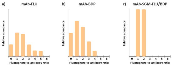 Relative abundance of labelled antibodies in each AFC according to their fluorophore-to-antibody ratio (FAR): (a) mAb-FLU 9b and 10b; (b) mAb-BDP 9a and 10a; (c) mAb-SGM-FLU/BDP 7a, 7b, 8a, and 8b. The average FAR is 1.5 for all AFCs. mAb = TTZ or RTX. Abbreviations: BDP = BODIPY; FLU = fluorescein; TTZ = trastuzumab; RTX = rituximab.