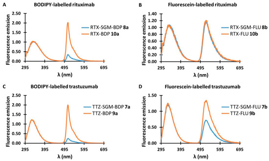 All SGM-based AFCs 7a, 7b, 8a, and 8b were very stable over time in these storage conditions. However, we observed discrepancies in behavior with lysine-conjugated AFCs. Indeed, while TTZ-BDP 9a and RTX-BDP 10a were stable over time, TTZ-FLU 9b and RTX-FLU 10b showed a fluorescence increase upon storage, which can be explained through an mAb macromolecular structure reorganization, limiting dye exposure to the aqueous buffer, i.e., to the fluorescence quenching by chloride ions [30]. Thus, the lysine-conjugated fluorescein dye became more protected from the aqueous environment after two months of storage. These structural modifications could hamper the reproducibility of assays carried out with lysine-labelled AFCs after storage over long periods of time. Fluorescence emission results demonstrated that cross-linked AFCs were more reliable over time.