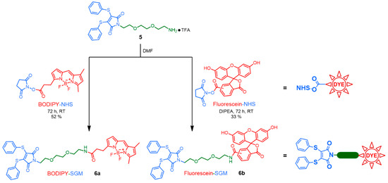 BODIPY-NHS and Fluorescein-NHS, in the presence of compound 5, afforded the desired BODIPY-SGM 6a and Fluorescein-SGM 6b, respectively (Scheme 1). Fluorescein-NHS was less reactive and necessitated the addition of N,N-diisopropyléthylamine (DIPEA) to react on 5.