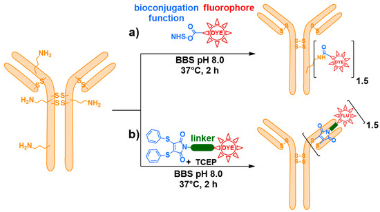 Antibody–fluorophore conjugates (AFCs) are classically generated by chemical conjugation methods onto amino acids [2,7] using fluorescent dyes functionalized with reactive moieties allowing covalent attachment to amino acid lateral chains of the antibody. Amine, sulfhydryl, carbohydrate, or disulfide bonds are among the most favored reactive moieties for bioconjugation. Commercially available fluorescent labelling kits contain dyes bearing an N-hydroxysuccinimide (NHS) ester (Scheme 1) or an isothiocyanate function, permitting bioconjugation onto the ε-amino group of solvent-accessible lysines at the mAb surface (Scheme 2a). Up to 30 lysines can be randomly labelled using these methods [8], leading to heterogeneous mixtures of AFCs with varying numbers of fluorophores attached at different positions on the mAb, determining the FAR (fluorophore-to-antibody ratio). This method remains the most widely used for labelling. However, the lack of information provided within labelling kits contributes to these issues. Generally, the manufacturers invoke intellectual property issues to retain technological information regarding both the dye concentration and the buffer composition. As a consequence, it is impossible to estimate the number of conjugated dyes per labelled mAb and their localization on the protein. Moreover, conjugated lysines in the complementary determining region (CDR) or next to essential residues for Fc receptor (FcR) binding can respectively alter the affinity to antigen or effector properties of the labelled mAb [9,10,11]. The field of antibody–drug conjugate (ADC) research has widely described that conjugation site has a great impact on ADC physico-chemical properties including bond stability between the conjugated molecule and the mAb [12]. In this context, two recent publications compared various labelling methods [13,14]. While the authors confirmed previously described advantages and drawbacks associated with lysine conjugation, cysteine labelling also came with limitations. Even though first-generation maleimide (or FGM) [13] allows for covalent linkage to the cysteines of a reduced interchain disulfide bridge (mild reduction using either dithiothreitol (DTT) or tris(2-carboxyethyl) phosphine (TCEP)), it is relatively unstable, [15] undergoing a retro-Michael addition in aqueous or serum media, resulting in payload loss over time. This phenomenon could impair the stability of labelled mAbs, compromising biological studies employing them as biological tools. To challenge lysine conjugation, an alternative labelling method should be easy to use, simple, fast, and allow for a reproducible FAR.