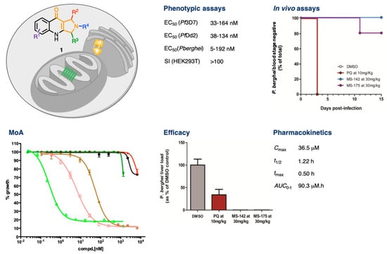 In this communication, we report the results from a medicinal chemistry programme focused on a pyrroloquinolone (PQ) series targeting the Plasmodium falciparum mETC (mitochondrial electron transport chain). This previously unknown series 1 was tested against blood- and liver-stage malaria parasites and our hit compound revealed excellent dual-stage inhibitory activity. The plausible structure–activity relationships and the inhibition of mETC components (cytochrome bc1, dihydroorotate dehydrogenase) will be discussed in this communication. In addition, our hit compound interfered with calcium homeostasis in transgenic malaria parasites. The interactions between the lead compounds and target were confirmed by docking. Our hit compound also revealed a good selectivity index, in vivo efficacy and favourable pharmacokinetic properties (Figure 3).