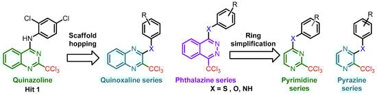 In parallel, to complete the global SAR study using the scaffold hopping approach, we replaced the quinoxaline ring with a phthalazine one. The importance for the antiplasmodial activity of the phenyl ring contained in the bicyclic quinazoline and quinoxaline scaffolds was also studied by structural simplification, leading to the related pyrimidine and pyrazine analogues. The synthesis details of the new analogues of hit 1 in various series and the biological results will be described in the poster.