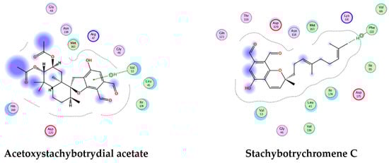 2D representation of the interaction between the ATP binding site of CK2 with acetoxystachybotrydial acetate and stachybotrychromene C.
