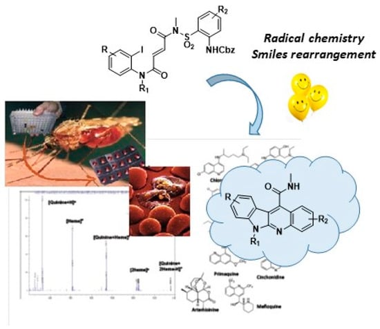 The indolo [2, 3-b] quinoline system is present in many marine alkaloids that have demonstrated interesting biological activity (for a review on biological activities, see: Lavrado, J., et al. Curr. Med. Chem. 2010, 17, 2348–2370). Smiles rearrangement, an organic intramolecular nucleophilic aromatic substitution reaction, provides a powerful access to the synthesis of a variety of heterocyclic compounds (Figure 24). Taking advantage of the combination of Smiles rearrangement and radical chemistry, preparation of new indolo [2, 3-b] quinoline derivatives and their biological evaluation will be presented (Allart-Simon, I., et al. Molecules 2016, 21, 878–889; Pudlo, M., et al. Chem. Comm. 2012, 48, 2442–2444).