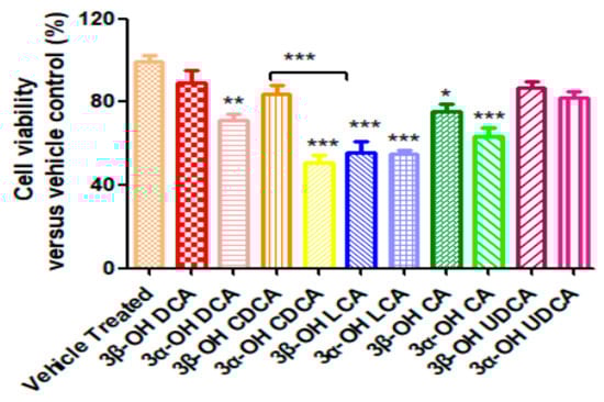 A measurement of toxicity of different bile acids. Caco-2 cells were treated with 100 μM bile acid solution for 24 h, and cells were then treated with 10 μl of 2.5 mg/ml MTT reagent and incubated for 2 h.