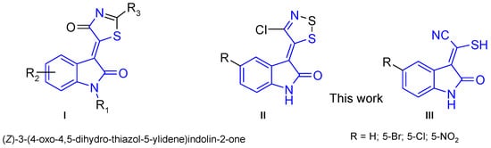 The (Z)-3-(4-oxo-4,5-dihydro-thiazol-5-ylidene)indolin-2- one pattern I and targets synthesis 3-(4-chloro-5H-1,2,3-dithiazol-5-yliden)indolin-2-one II and (2-oxoindolin-3-ylidene)-2-mercaptoacetonitrile III.