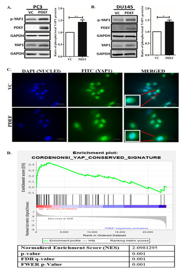 To investigate the relationship between PDEF and YAP1, levels of total YAP1 and phosphorylated YAP1 (Ser127) protein were analyzed in PDEF-PC3 and PDEF-DU145 cells [21], and VC-PC3/VC-DU145 cells by western blots. We observed that PDEF-PC3 and PDEF-DU145 cells have a higher amount of YAP1 protein levels (total and phosphoprotein (Ser127) levels) as compared to VC-PC3/VC-DU145 cells (Figure 1A,B). Moreover, quantitation of Phospho-YAP1 Protein (Ser127) and YAP1 protein levels revealed that PDEF expression results in an increased Phospho-YAP1 Protein (Ser127)/YAP1 protein ratio, suggesting potential inhibition of YAP1 mediated transcription. Furthermore, analysis by immunofluorescence (IMF) for YAP1 showed more cytoplasmic YAP1 levels in PDEF-PC3 cells as compared to VC-PC3 cells (Figure 1C). To further elucidate the mechanistic role of PDEF in regulating YAP1 levels, we analyzed mRNA expression data generated in the Affymetrix format, from PDEF-PC3 and VC-PC3 cells that we have described previously (GSE108641) [25]. Gene set enrichment analysis (GSEA) of mRNA expression in PDEF-PC3 and VC-PC3 cells revealed that PDEF inhibits expression of YAP1 target genes (Figure 1D), directly demonstrating that PDEF plays a critical role in modulating YAP1 transcriptional activity, and by extension in the regulation of the Hippo pathway. These results are the first direct demonstration of regulation of YAP1 by PDEF in any system.