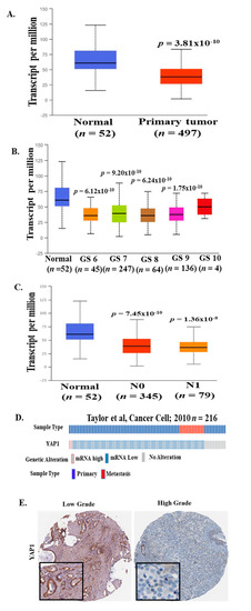 YAP1 mRNA expression in multiple PCa clinical cohorts. YAP1 mRNA data were analyzed from The Cancer Genome Atlas (TCGA) datasets through UALCAN and the c-Bioportal web server. (A) mRNA level of YAP1 was significantly decreased in primary prostate tumors as compared to normal prostate tissues. (B) A decrease in YAP1 mRNA levels was observed in patients with a higher Gleason score (TCGA datasets) as compared to normal controls. (C) YAP1 mRNA levels were significantly decreased in PCa patients irrespective of lymph node metastasis as compared to normal controls (TCGA datasets). (D) 51% of patients showed a genetic alteration in YAP1 mRNA levels in the Prostate Adenocarcinoma MSKCC dataset. [31] (E) Representative images is from The Human Protein Atlas showed a decreased level of YAP1 protein in high-grade PCa tumor samples as compared to low-grade PCa tumor samples.
