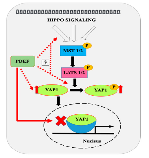 Proposed model for modulations of Hippo pathway by PDEF. Our results show that PDEF increases expression and phosphorylation (Ser127) of YAP1 in prostate cancer cells. We hypothesize that PDEF might regulate YAP1 phosphorylation indirectly by modulating expression and or activities of various components of the Hippo pathway as shown. PDEF overexpression inhibits the YAP1 conserved gene signature. Dashed red lines indicate hypothetical links, while solid black lines indicate currently established pathways. The solid red line link was established for the first time in the present study.