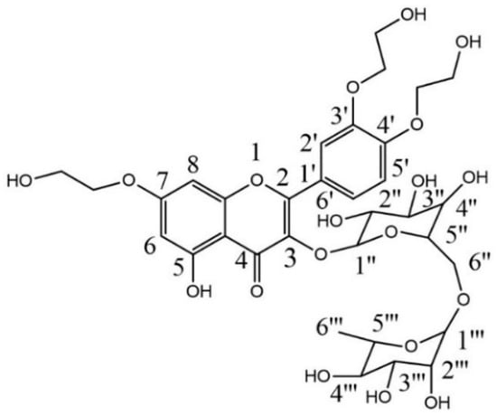 The DEPT-135 spectrum signals between δ 70.9 and δ 59.7 were observed for the presence of ether oxygenated methylene groups (OCH2CH2OH). The data indicated a mix of O-β-hydroxyethylated compounds, where the majoritarian compound was trihydroxyethylrutin (Figure 1). Structural elucidation of TRX, semi-synthesized by 1H and 13C NMR are shown in Table 1. Such attributions corroborate with those reported by Xiao et al. [] and Xu et al. [].