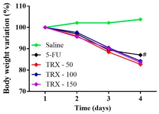 Body weight variation in mice subjected to induced intestinal mucositis (5-FU, 450 mg/kg, ip, single dose) and treated with TRX (50, 100, and 150 mg/kg for 3 days). The results are expressed as the mean ± SEM of the weight evaluation percentage of the initial weight, of a minimum of six animals per group. Two-way ANOVA followed by the Tukey’s test were used for the statistical analysis, where # p < 0.05 vs. saline and * p < 0.05 vs. 5-FU.