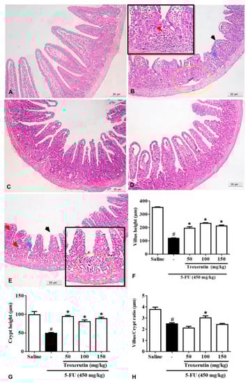 Histopathological analysis of duodenum. (A) Saline; (B) 5-FU; (C) TRX-50; (D) TRX-100; (E) TRX-150. 5-FU induced inflammatory cell infiltrate (red arrow), decreased intestinal villi (black arrow), loss of intestinal crypt architecture (blue arrow), edema (yellow circle). Pretreatment with TRX (50, 100 and 150 mg/kg) decreased the inflammatory infiltrate and prevented the shortening of the villi (F), increased crypt depth (G) and decreased villus/crypt ratio (H), with greater reversion of the 5-FU effect in the TRX 100 + 5-FU group. Values were expressed as mean ± SEM. One-way ANOVA followed by the Tukey’s test were used for the statistical analysis was used, where # p < 0.05 vs saline group and * p < 0.05 vs group 5-FU.