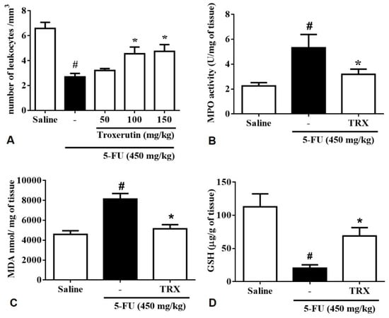 (A) Total leukocyte count; (B) Activity of myeloperoxidase (MPO); (C) Level of malondialdehyde (MDA); (D) concentration of glutathione (GSH). For evaluations of MPO, MDA, and GSH, the dose of TRX used 100 mg/kg. Values were presented as mean ± SEM. For the statistical analysis, one-way ANOVA followed by Tukey’s test was used, where # p < 0.05 vs saline group and * p < 0.05 vs group 5-FU.