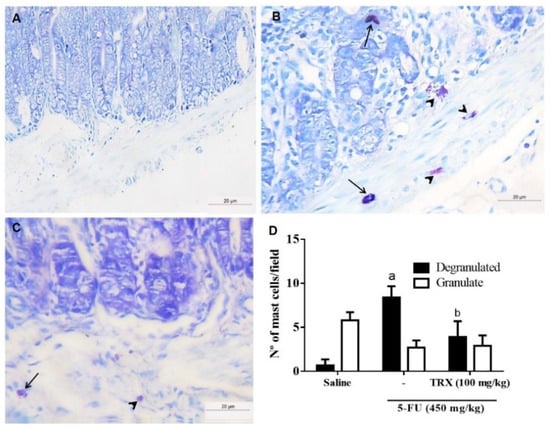 To evaluate the effect of TRX pretreatment on 5-FU-induced mastocytosis, the number of mast cells in the duodenum was measured (Figure 5). The 5-FU treatment significantly increased the number of degranulated mast cells per field (8.40 ± 0.52, p < 0.05) compared to that of saline treatment (0.70 ± 0.25, p < 0.05). Administration of 100 mg/kg of TRX (Figure 5C) reduced the number of degranulated mast cells (3.90 ± 0.52, p < 0.05), thus preventing 5-FU-induced mastocytosis and degranulation in mouse intestine (Figure 5B,D).