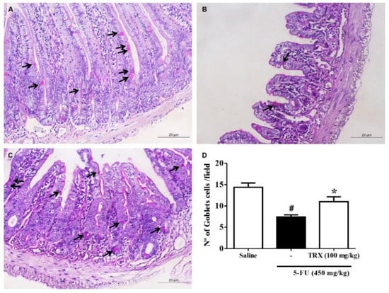 Analysis of goblet cells in the duodenal segment (Figure 6) showed that 5-FU treatment significantly decreased (p < 0.05) the number of goblet cells in the intestinal mucosa (7.42 ± 0.48) compared to that of saline treatment (14.38 ± 1.01). However, treatment with 100 mg/kg of TRX resulted in preservation of the number of goblet cells (11.00 ± 1.15, p < 0.05, Figure 6C) compared to that of 5-FU treatment (Figure 6B,D).