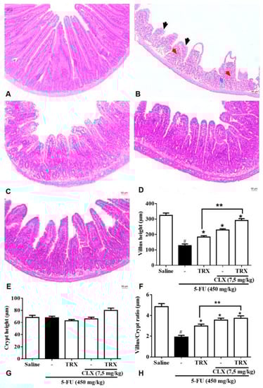 Overall, the results (Figure 7A–E) showed that 5-FU promoted reduction of villus height, loss of villus and crypts architecture, edema, and increase in inflammatory infiltrate compared to that of saline treatment. Further, TRX and/or CLX treatment prevented the effects of 5-FU treatment.