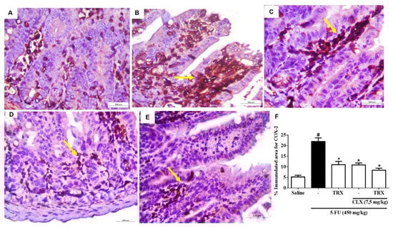 Immunohistochemistry analysis for COX-2 expression evaluation. Saline (A); 5-FU (B); TRX-100 (C); CLX (D); TRX and CLX (E); % immunolabelled for COX-2 (F). Values were expressed as mean ± SEM. For statistical analysis, one-way ANOVA followed by Tukey’s test was used, where # p < 0.05 vs. saline group, * p < 0.05 vs. group 5-FU.