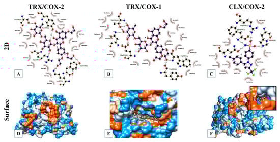 Molecular docking models of TRX or CLX with COX-1 and COX-2. (A), (B), and (C): Ligplot 2D diagrams showing details of hydrogen bond and hydrophobic interactions in complexes TRX/COX-2, TRX/COX-1, and CLX/COX-2, respectively. (D), (E), and (F): Surface docking poses of TRX/COX-2, TRX/COX-1, and CLX/COX-2, respectively.