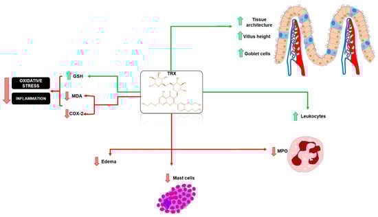 The inflammatory processes, such as intestinal mucositis, results in an imbalance between the pro-oxidant and antioxidant systems causing oxidative stress. It is characterized by the production of reactive oxygen (ROS) and nitrogen (RNS) species, and free radicals. These reactive species interfere with the regular physiological process, which further causes structural and/or functional damage []. As shown by our study, TRX treatment (100 mg/kg) reverses the 5-FU-induced increase of MDA levels and prevents GSH consumption in mice. The antioxidant effect of TRX shown in the present study has also been reported by several published studies in different experimental models [,,,,,,,,].