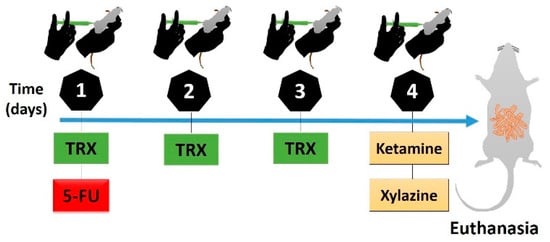 The experimental model of intestinal mucositis in Swiss mice was induced as described by Soares et al. []. 5-FU (450 mg/kg) was administered intraperitoneally (i.p) as a single dose on the first day of the experimental protocol. To evaluate the effective dose of TRX against 5-FU-induced morphological changes, 50, 100, and 150 mg/kg of TRX was administered orally on the first, second and third day respectively. First dose of TRX was administered 1 h before 5-FU injection, whereas, second and third doses were administered 24 and 48 h after 5-FU injection, respectively. On the fourth day of the experimental protocol, the animals were euthanized by anesthetic overdose of ketamine and xylazine (270 mg/kg and 15 mg/kg, respectively). Blood and intestinal samples were collected. The induction and treatment regimen is shown in Figure 11. The body weight of mice was assessed daily prior to administration of the administered treatment to confirm the experimental model of 5-FU induced intestinal mucositis. The TRX doses considered in the current study are in accordance with those in previous published studies [,,,,].