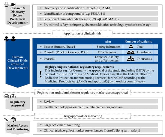 To ensure the continuing clinical development and use of these radioligands, there is an urgent need for prospective trials. In order for these promising radiopharmaceuticals to be applied in the routine clinical setting and find their way into the guidelines, the PSMA-tracers need to be approved by the respective authorities. To comply with the requirements, there is an increasing number of initiated prospective clinical trials of different phases to further advance PSMA-radioligands [19,20,21]. Figure 1 schematically shows the different phases of the admission process of innovative (radio-) pharmaceuticals in analogy to the admission process of all drugs and medicinal products. Clinical trials of this kind are paramount to ensure and validate the safety, efficacy and optimum dose of the drug to be applied. The initiation of prospective (multi-center) trials in nuclear medicine is especially complex because there are not only the Good Manufacturing Practice (GMP) guidelines for the production of not yet approved (radiopharmaceutical) medicinal products for clinical trials to follow but also laws and regulations of radiation protection to abide by and a plurality of permissions/licenses to obtain (e.g., study approval including investigational medicinal product dossier (IMPD), manufacturing license for the investigational medicinal product (IMP) and ethics approval).