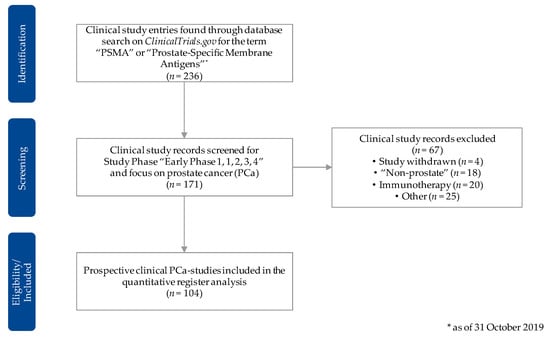 For the data acquisition, we first of all used the “advanced search” option on the ClinicalTrials.gov website and scanned for all clinical trials with the key words “prostate-specific membrane antigens” and/or the acronym “PSMA.” We then exported the resulting data set, with the cutoff date being 31 October 2019, in the csv-format. Subsequently, we excluded all studies that were not categorized in one of the clinical phases (early phase I–phase IV) of a prospective clinical trial. We then screened the data set in detail to only include trials that used PSMA-radioligands for the diagnosis and/or treatment of prostate cancer. All trials that were categorized as “withdrawn” or did not primarily focus on PSMA-radiotracers for prostate cancer were excluded. We used further available information, including the free-text sections, to filter the trials accordingly and identify the applied radiotracer(s). Figure 2 shows the methodic approach to sustain the data set for our registry data analysis in a flowchart.
