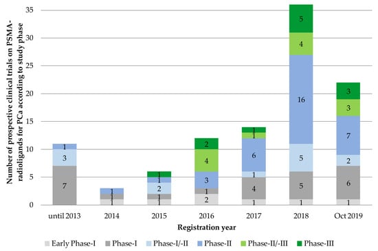 We found n = 104 eligible prospective clinical trial entries on PSMA-radioligands for the diagnosis and therapy of prostate cancer. Sorted by registration year, we found a continuous rise in the number of listed prospective PSMA trials from 2014 till 2018 with the steepest increase between 2017 and 2018, from n = 14 to n = 36 initiated trials. In 2019, this trend seems to curb with n = 22 newly registered trials at cut-off date 31 October 2019, although the validity of this statement is limited due to the (still) comparatively small number of clinical PSMA-trials analyzed. Due to the small numbers of registered trials per year before 2014, we decided to add up all listed trials before that year (Figure 3).