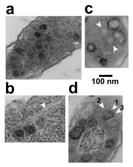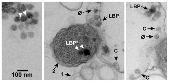 In the field of Figure 2, larger-than-phage, black particles (LBPs) were also present. An extracellular aggregate of LBPs is at the top of the left panel of Figure 2. The LBPs of this aggregate had the appearance of condensed, intracellular phage DNAs, previously seen for phages lambda and T4 [17,18,19,20,21]. In theory, the aggregated, extracellular LBPs also could have been precipitates of stain.