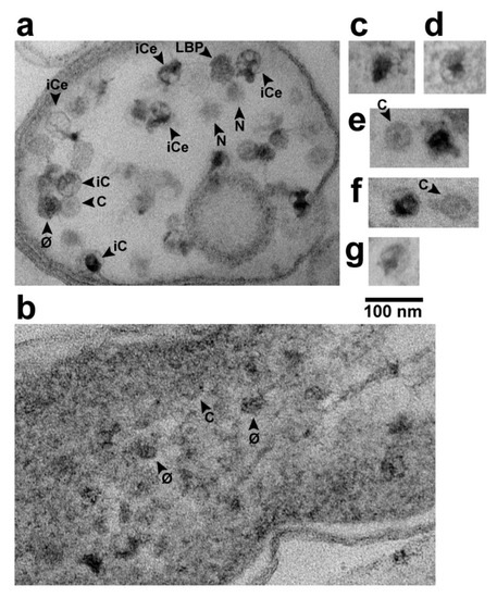 Images of others were smaller, e.g., the LBP* at the left in the middle panel of Figure 2. The smaller size can be caused by absence of an LBP equator in the section. One LBP was observed in Figure 3a, along with images with the expected appearance of either an LBP or φ sectioned without an equator, e.g., particles labeled N in Figure 3a.