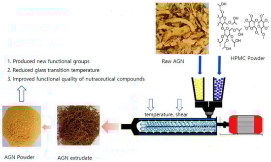 Three types of food grade hydroxypropyl methylcellulose (HPMC) biopolymers were donated by the Lotte Food Co. Ltd., Seoul, Korea. The HPMC was graded according to its functional groups and physicochemical characteristics (Table 1). The AGN–biopolymer–plasticizer composite (AGNC) was prepared with 5% of HPMC (w/w) along with 0.1 M acetic acid (AA) (20% w/v) by the hot melt extrusion (HME) described in Table 2. The HME (STS-25HS twin-screw, Hankook E.M. Ltd., Pyoung Taek, Korea) was equipped with a round-shaped die (1 mm) at a feeding rate of 40 g/min, rpm 220 with high shear stress (a pressure range of 100–150 bar). The temperature profile of the HME barrel from the feeding zone to die was 80/100/120/80 °C. The HME temperatures were set above the gelling temperature of the HMPC, to facilitate the miscibility of the AGN powder and biopolymer. The AGNC solid extrudate was dried in an oven at 50 °C then ground for further analysis.