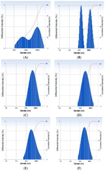 Particle size distribution of the AGNC formulation. (A): FAGN; (B): EAGN; (C): AA-EAGN; (D): HP-AA-EAGN; (E): CN-AA-EAGN; (F): AN-AA-EAGN. HP/CN/AN-AA-EAGN: HPMC (5% w/w) mediated AA-EAGN.